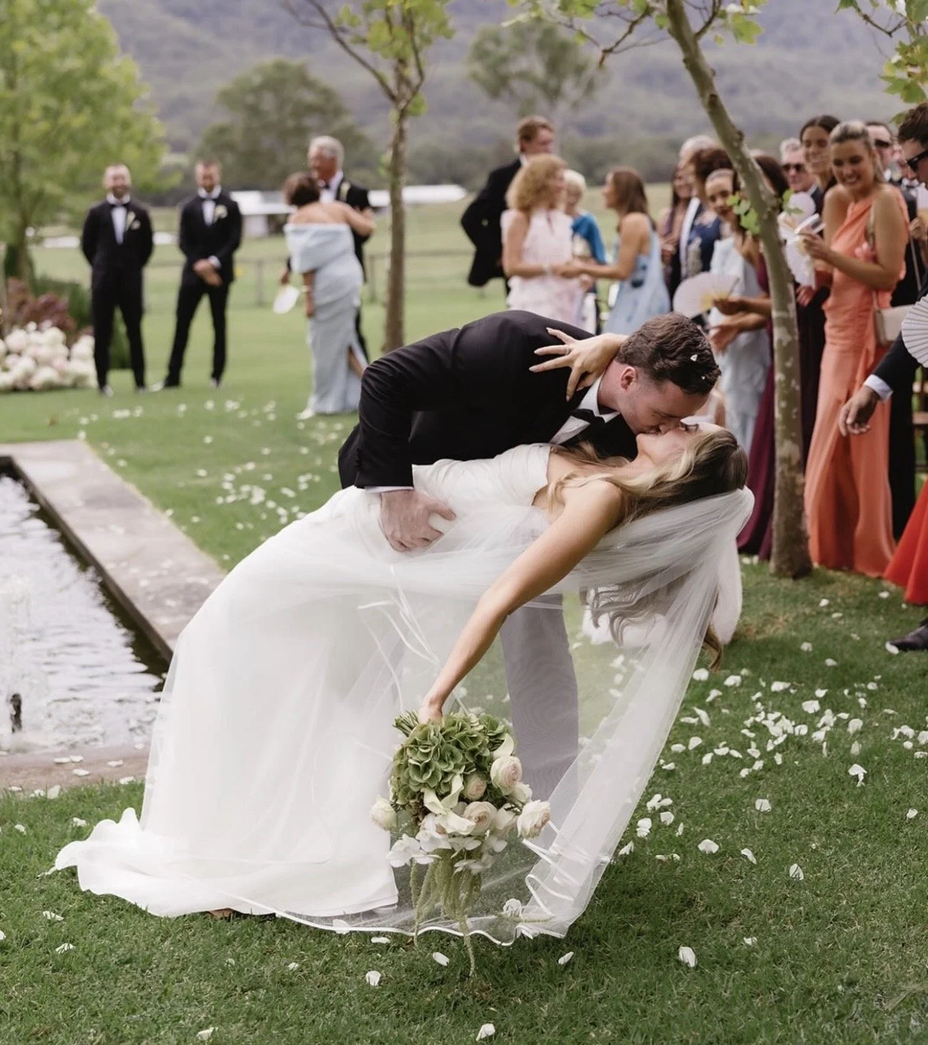 Lexi wore a luxurious satin gown, featuring hand-draped design details that created soft movement and elegant structure. Crafted from 100% silk gazer, the gown featured intricate draping that was intentionally hand-placed and sewn to contour her body, following the soft lines of the design. The result was a modern yet timeless aesethic, balancing structure with softness. It was a true collaboration between the designer and the bride, built on trust and a shared vision to bring her dream gown to life. To complete th look, Lexi paired her gown with a ribbon-edged blusher veil, completing the ensemble with understated elegance.